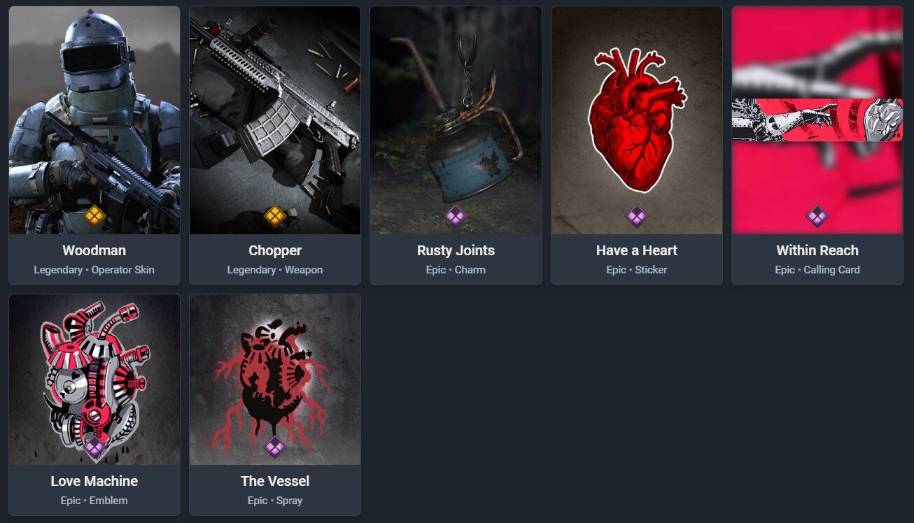 A Velikan: Heartless, ahogy a neve is sugallja, a kemény, „szívtelen” játékosoknak lett kitalálva. Woodman egyszerre idézi a sötét középkort és a Robotzsaru filmeket, ez a kettősség pedig nagy meglepetésre igazán jól áll neki. A mellé csomagolt Legendary blue print mellett Charm, Calling Card, Sticker, valamint egy Emblem és Spray is került a Bundle-be.