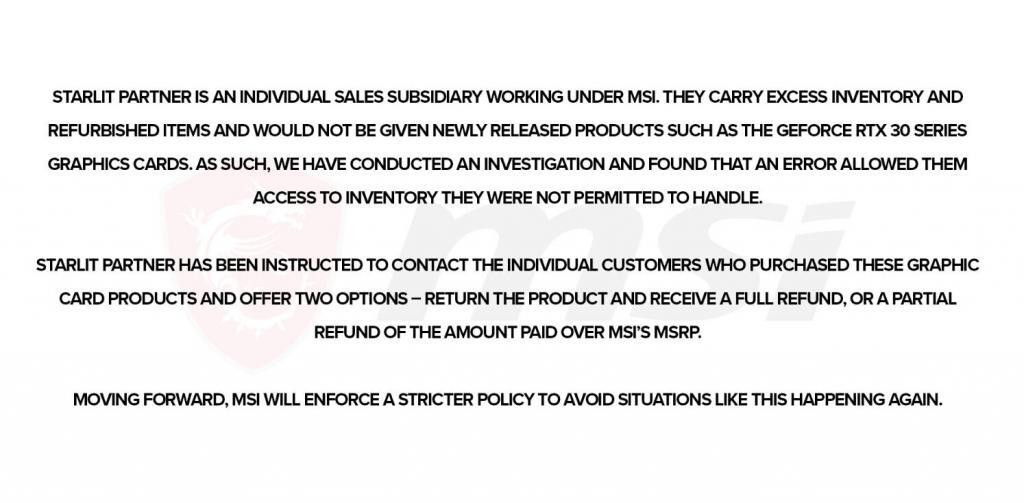 Ezek között tűnt fel egy eladó, aki az eredetileg kitűzött 699 dolláros árcédula helyett 1360 dollárért árulta az RTX 3080-asokat. Miután egy felhasználó jobban utánament a dolgoknak, kiderült, hogy a kártyák eladása mögött a Starlit áll, ami történetesen az MSI egyik leányvállalata. Az ügy hamar nagy port kavart, ezért az MSI is megszólalt és gyakorlatilag elismerték, hogy a leányvállalatuk állt az adás-vételek mögött. Továbbá arra is fény derült, hogy azokból a készletekből akasztottak le, amik egyébként a kereskedőknek mentek volna tovább, így nem csoda, hogy nem ért célba elegendő kártya.