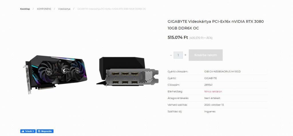Ameddig külföldön mindenki az eBay-es hirdetésekre van ráfeszülve, addig a hazai piacon inkább a tech cserebere oldalakon zajlik az élet. A jófogáson egyetlen kártyát találtunk, de azt is fátyolos hirdetési szöveg jellemezte. A webshopoknál pedig nemrég még elérhető volt a kártya, de aki most akarna RTX 3080-at rendelni, az a következő felületet látja: