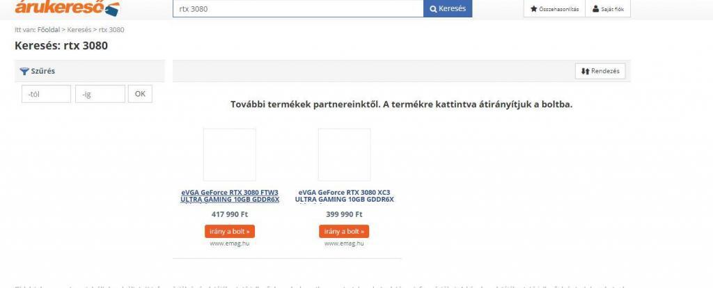 Egy pillanat erejéig se higgye senki, hogy a „további termékek” címszó alatt lévő 400 ezres és 418 ezres eMag hirdetések élnek. Ott sem rendelhető a kártya. Bezzeg két napja még lehetett új RTX 3080-hoz jutni.