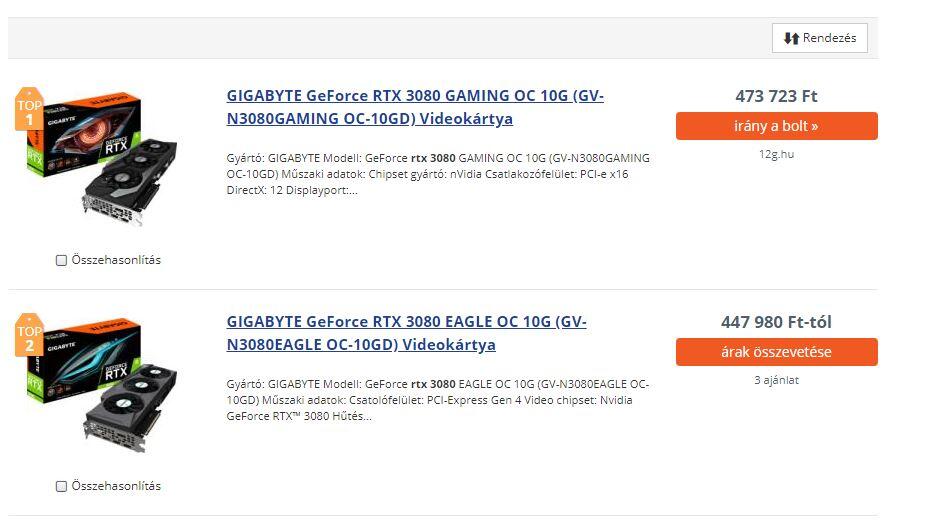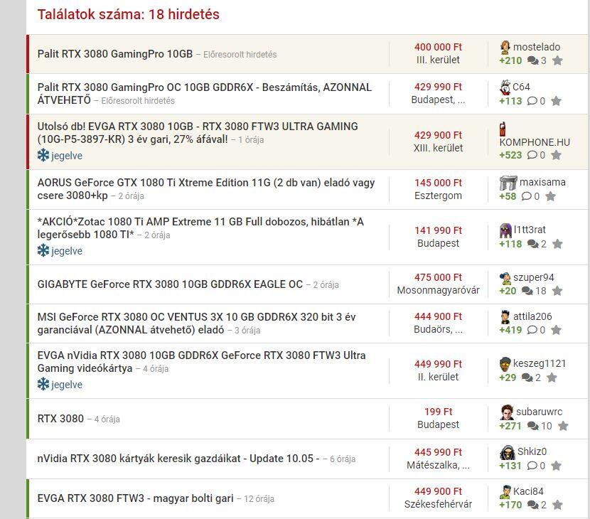 Legolcsóbban a Palit legolcsóbb hűtésű Gaming Pro vihető 400 ezer forintért, ez egyébként 257 ezer forintba kerül, így ha nem nagykertől szerzik be az árut, akkor is instant 143 ezer forintos profitot realizálnak az eladók. Az is érdekes, hogy az eredetileg Apple termékekkel foglalkozó komphone.hu is feltűnik az eladók között, ők 429 900 forintért hirdetik az EVGA féle RTX 3080-asakat. Itt megjegyeznénk, hogy ezeket mindenképp érdemes jobban szemügyre venni vásárlás előtt, ugyanis ezek a kártyák is érintettek a kondenzátorproblémákkal kapcsolatban.