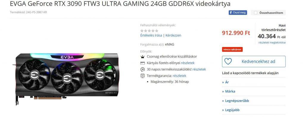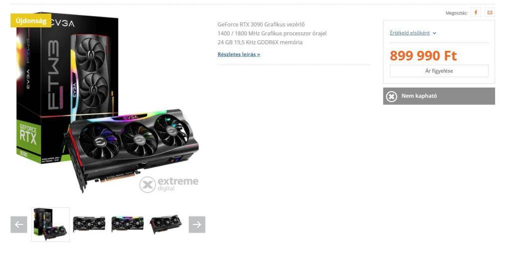 Az eMag kínálatában egyébként a cikk írásának pillanatában 795 990 forintnál indult a legolcsóbb RTX 3090, a legdrágábban pedig az előbb említett EVGA FTW3 Ultra Gaming hozható el 919 990 forintos áron. Az Extreme Digital áruházából sem hozható el sokkal kedvezőbben a kártya, itt 899 900 forintot kell kifizetnünk az amúgy 1499 dolláron (450 ezer forinton) hirdetett kártyáért.