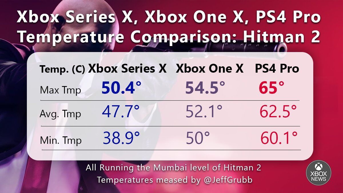 Az Xbox Series X átlag-hőmérséklete a folyamat során 47,7 fok volt, a maximális 50,4 fok. Jól látható, hogy ez a PS4 és az Xbox One X hőmérséklete alatt van. Grubb később kijelentette, hogy a teszt nem tökéletes, de bizonyítékul szolgál arra, hogy nem lesznek túlmelegedési problémák az Xbox Series X-nél.