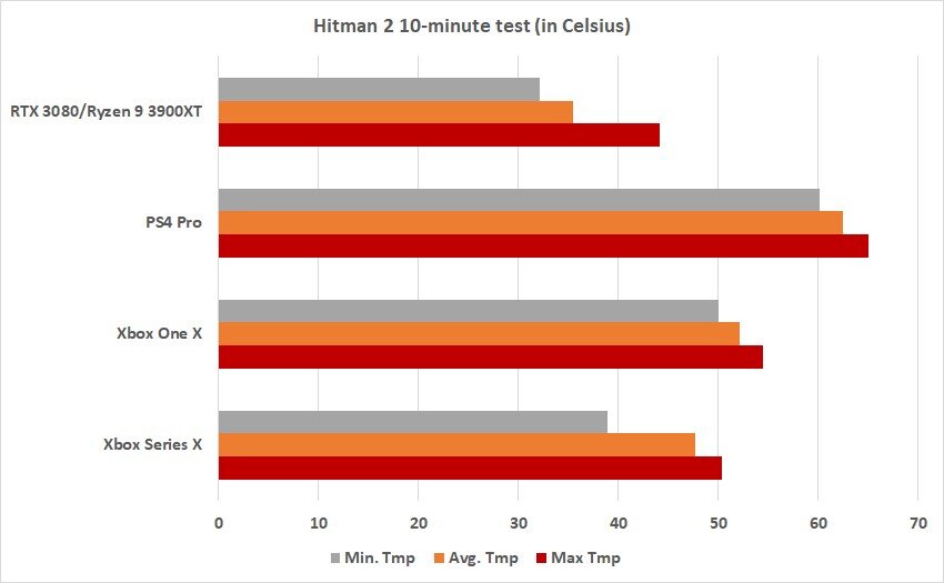 A VentureBeat munkatársa, Jeff Grub nem csak tesztelte a konzol hőmérsékletét, de összehasonlította azt a PS4 és Xbox One X konzolokkal. Mivel Grubb nem szedte szét a konzolokat, az érzékelők nem a belső alkatrészekhez kerültek, csupán a konzol belső terébe. A teszteket a Hitman 2-val végezték, 10 perc játék alatt.