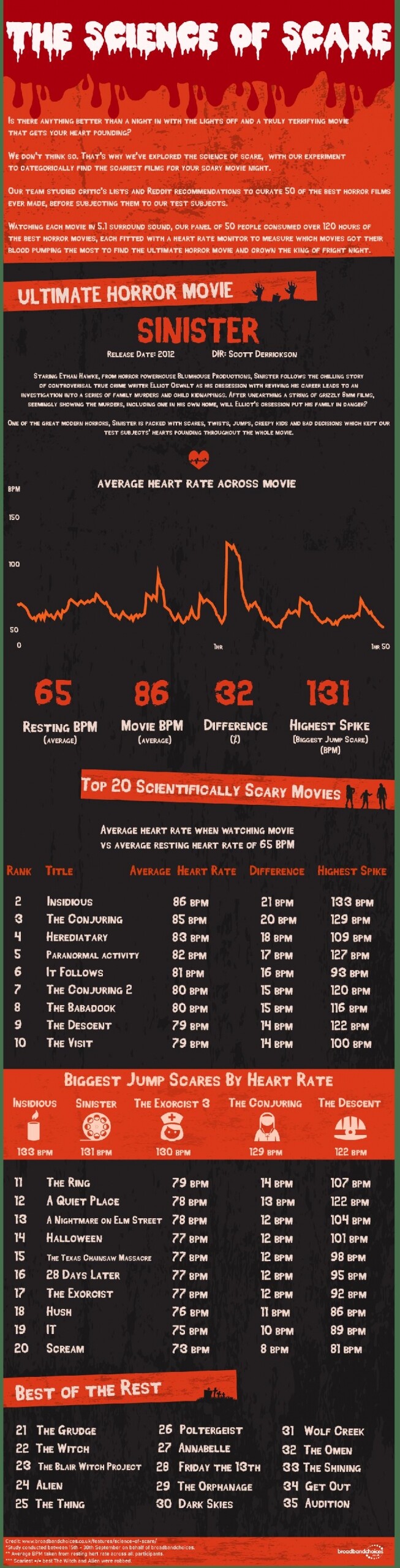 Végül sikerült ez alapján 35 filmre szűkíteni a listát. Aztán kiderült, hogy a kutatásban résztvevők szíve a 2012-es Sinister című horror alatt vert a leginkább. A résztvevők pulzusa a legtöbb filmnél 65/perc volt, de a Sinister nézése közben átlag 86/perc körül mozgott – írja az OffMedia.