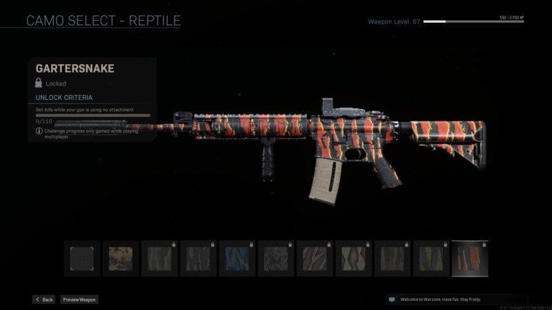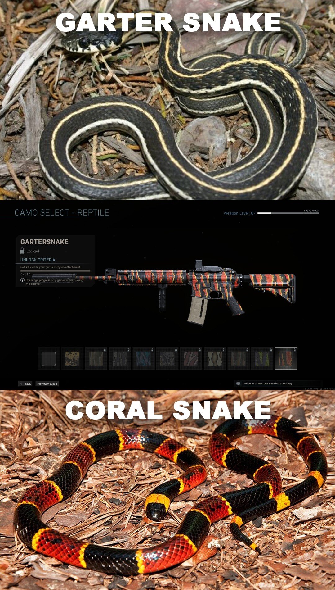 A Redditen dehaven11 jegyezte meg, hogy a játék egyik piros/narancssárga/fekete/sárga színekben úszó, kígyóbőrre emlékeztető skinje bár nagyon egyedi, a neve nem stimmel. A skin ugyanis a Gartersnake nevet kapta (szalagoskígyó), mely a felhasználó szerint nem egy Garter snake mintája. Az említett kígyó leggyakoribb fajtái inkább feketék és sárgák. A Modern Warfare skin inkább a korallkígyók színeire emlékeztet. Arról nem is beszélve, hogy szalagoskígyók gyakorlatilag ártalmatlanok, míg a korallkígyónak halálos a mérge.