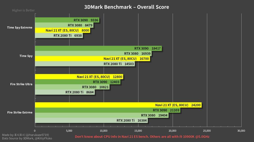 Nem csupán a CapFrameX műhelyébe jutott az új Radeonokból, a korábban Kitty Corgi néven ismert informátor is megszellőztetett pár teszteredményt. Ő is megerősítette, hogy a Fire Strike Ultrában valóban lenyomta az RTX 3090-et, sőt még Fire Strike Extreme-ben is, viszont a Time Spy és Time Spy Extreme tesztekben már az Nvidia fölényeskedett. Érdekes módon ezen utóbbi tesztekben még az RTX 3080 is lenyomta az RX 6800 XT-t.
