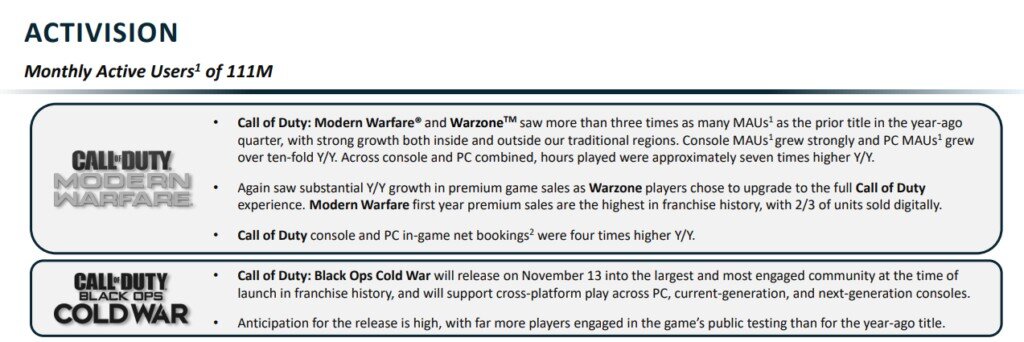 „Hihetetlenül nehéz körülmények között ugyan, de csapataink kiválóan haladnak a tervezett növekedés irányába” – mondta Bobby Kotick, az Activision Blizzard vezérigazgatója. Nagyrészt a Call of Duty jóvoltából az Activision nettó árbevétele 2020 harmadik negyedévében 773 millió dollár volt, a Modern Warfare és a Warzone játékon belüli mikrotranzakcióinak köszönhetően.