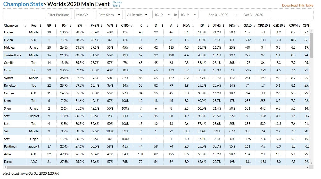 Ezt a statisztika is nagyon jól mutatja. Nem is kaphatott volna jobbkor Victorious skint a karakter, ugyanis a tiltási arányok szerint tényleg a legmeghatározóbb hőse volt a játéknak idén. A világbajnokságon az esetek 78,9%-ban tiltották a csapatok. Ha pedig bent maradt, szinte azonnal választották is. A választási és tiltási aránya 93,4%-on állt meg, vagyis mondhatjuk, hogy párszor elkerülte a játékosok figyelmét Lucian. Az is lehet, hogy a kivételek esetén draft malőr áll a háttérben.