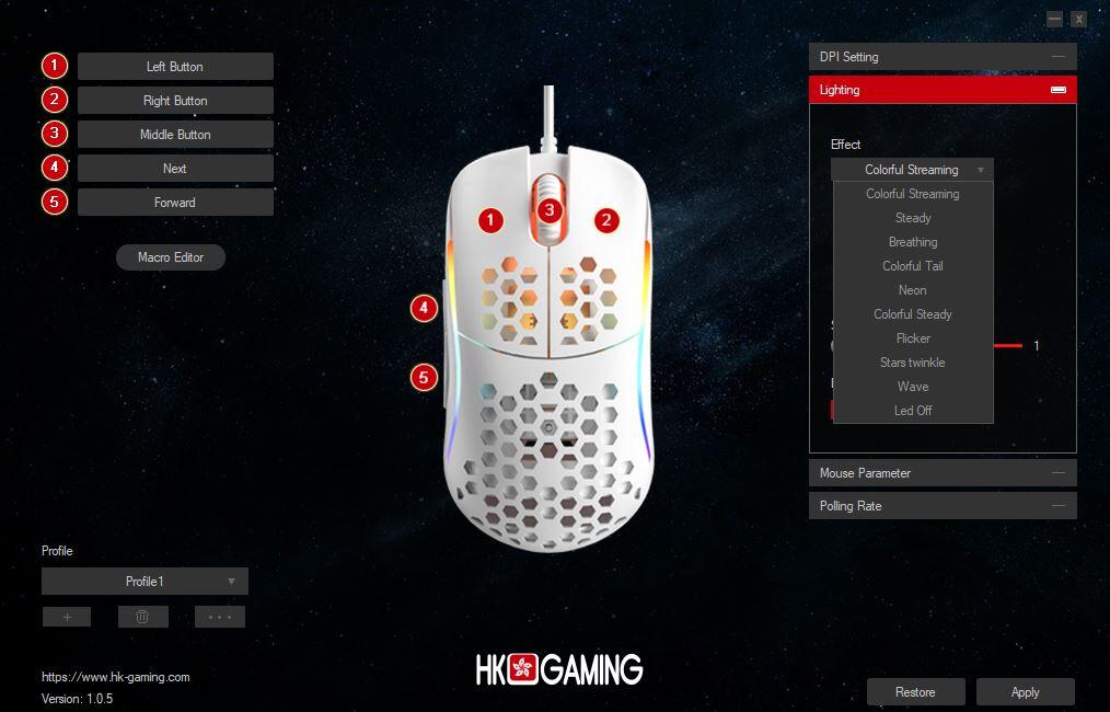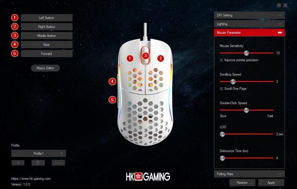 A szoftver nem egy rakéta tudomány. Nem túl csili-vili, viszont minden funkciót beállíthatunk. A DPI-tól kezdve (ráadásul 100-as lépcsőkben!), a világításon át az egér mélyebb beállításain mindent megtalálunk. Állítható a LOD és a kapcsolók válaszideje is, illetve a gombokat is módosíthatjuk és makrót is használhatunk, szóval tényleg minden van, mi szem, s szájnak ingere.