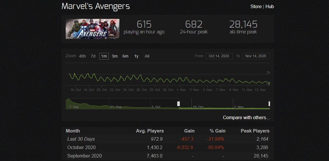A Steam Charts adatai szerint a PC-s Marvel’s Avengers játékosok a múlt hétvégén maximum 1190-en voltak online. Ez a szám pedig 96 százalékkal kevesebb, mint mikor a játék debütált a Steamen szeptemberben. Az elemzés szerint az elmúlt 30 napban átlag 972 játékos pörgette a címet.