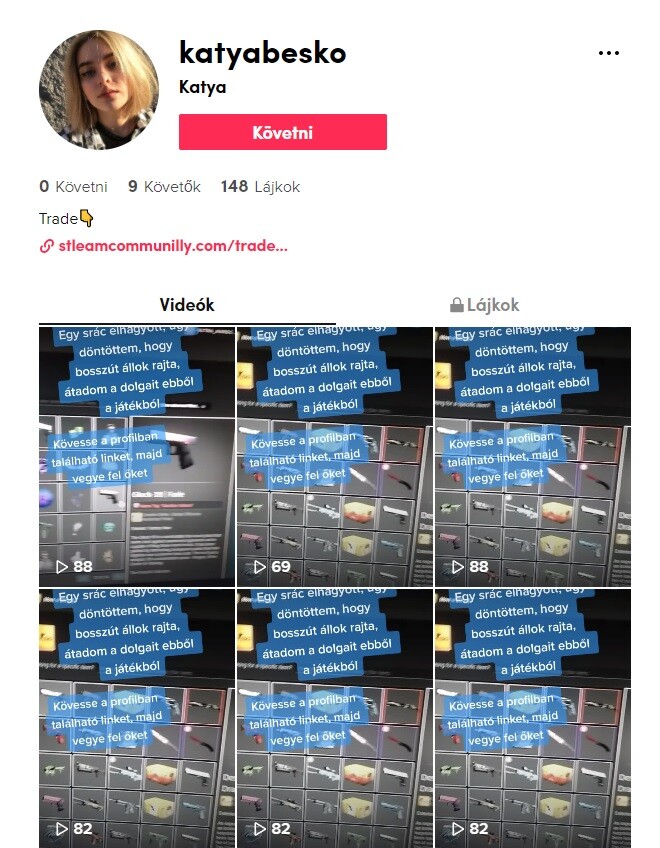 A profilon megosztott linken kezdődik az átverés, ezért senkinek sem ajánljuk, hogy a fenti profil Trade Offer linkjére rákattintson. És biztos nem ez az egyetlen hasonló TikTok profil, egy ilyet leklónozni csak másodpercek kérdése. Szerencsére ez az átverés még túl egyértelmű ahhoz, hogy bárki is bedőljön. De ismerve a scammereket, a jövőben sokkal kifinomultabb módszerek is érkeznek majd TikTokra.