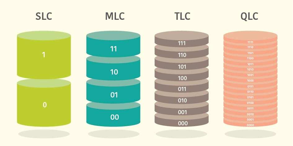 Már a technológiák elnevezése is sokat takar. Röviden, amíg az SLC (Single Level Cell) esetén egy memóriacellában 1 bit tárolódik, addig az MLC (Multi Level Cell) esetén 2, a TLC (Triple Level Cell) 3, a QLC-nél (Quad Level Cell) esetén pedig 4 bit tárolódik ugyanabban a cellában. Így értelemszerűen az SLC a legtartósabb, de ezzel együtt a legdrágább is.