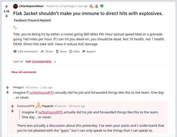A Treyarch munkatársa, Josh Torres azt írta a Redditen, hogy a témáról már folyt egy vita a fejlesztők közt. Bár nem részletezte a dolgot, látható, hogy a csapat tisztában van a problémával, még akkor is, ha még nincs konkrét terv a változásra vagy annak idejére.