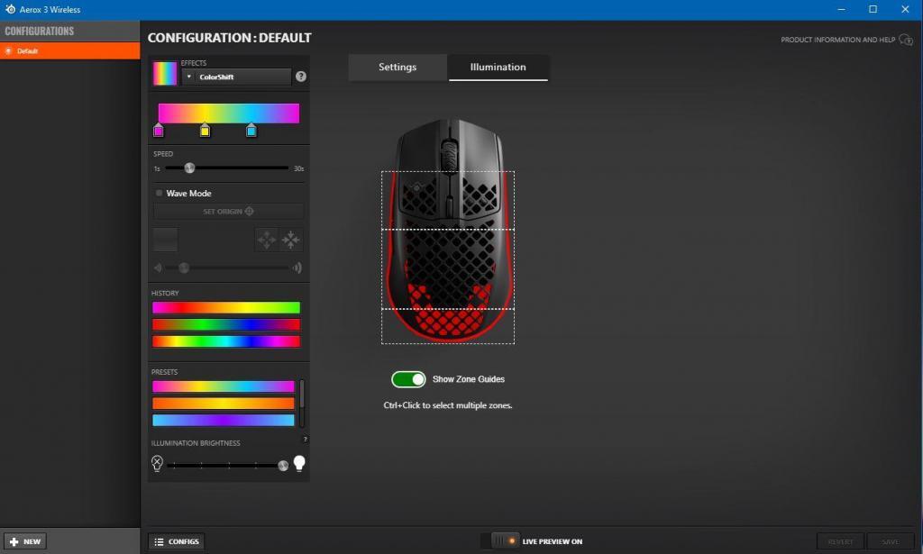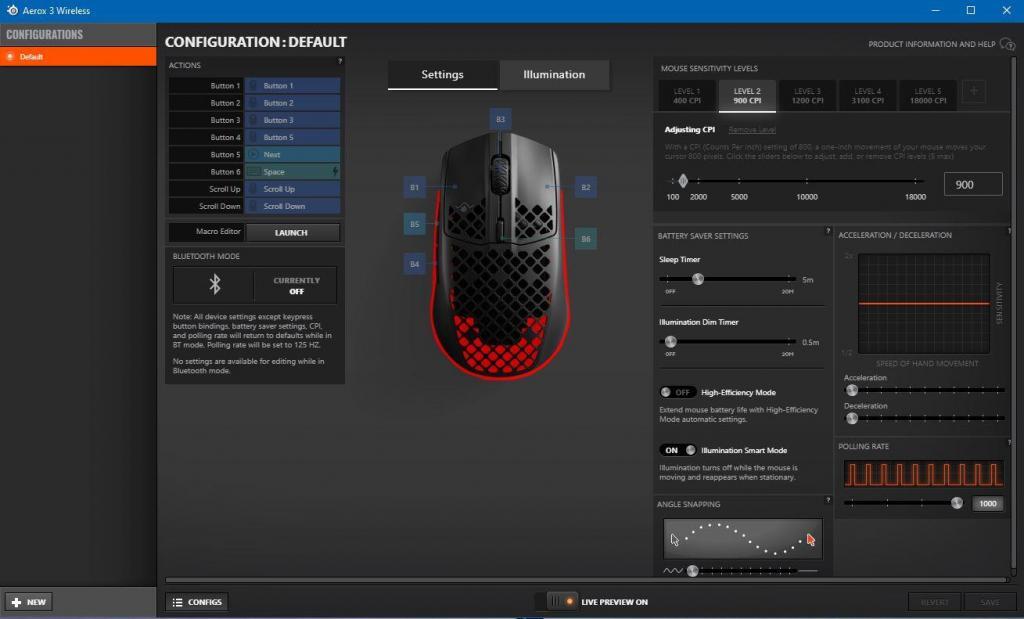 A SteelSeries szoftvere kivételesen ügyes. Rengeteg beállítási lehetőséggel kalkulálhatunk, viszont a fejlettebb funkciók azért hiányoznak, csak hogy egy példát említsek, a kattintás válaszidejét nem tudjuk módosítani. A világítást és makrókat viszont teljes mértékben testre tudjuk szabni, a világítási beállítások is viszonylag egyszerűen átláthatóak.