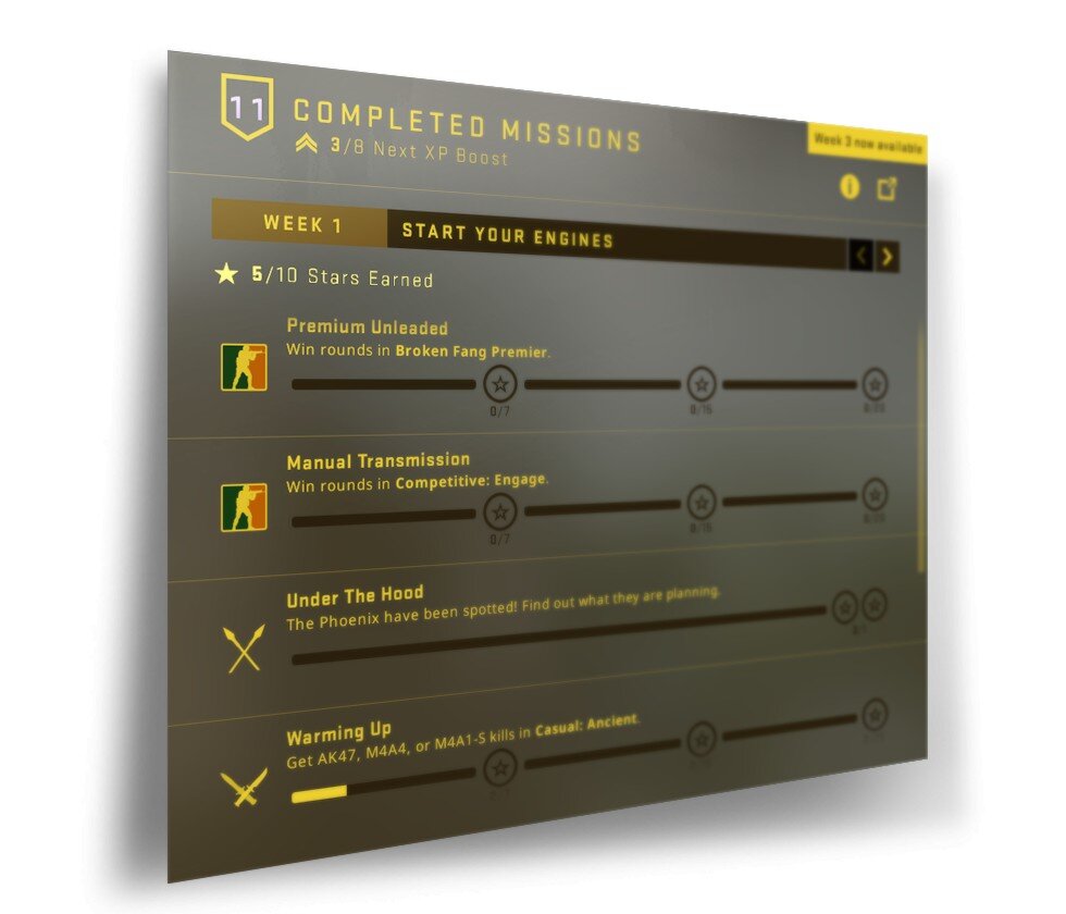 A folyamatosan érkező feladatokat Casual, Competitive, Danger Zone és Guardian játékmódokban teljesíthetjük, plusz a két új módban is lesz dolgunk: Retake és Broken Fang Premier küldetések is lesznek. A folyamatos fejlődésért persze egyre nagyobb elismerés jár, egy fejlődő Broken Fang Coin képében.