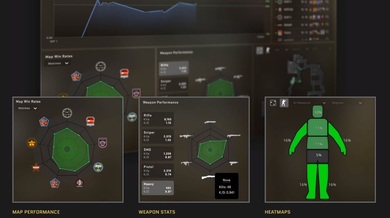 Mapokra lebontott teljesítmény, amellyel kiszűrhetjük a leggyengébb pályánkat. Sőt, a pályákról speciális hőtérképet is kapunk, hogy lássuk, merre mozgunk a legszívesebben támadásban és védekezésben. Emellett saját fegyver metánkat is elemezhetjük, hogy lássuk, mivel kellene még gyakorolni picit.