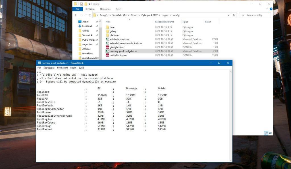 Legyen szó akár Steames vagy akár GOG verzióról, mindkettő esetén a Cyberpunk mappájában lévő „memory_pool_budgets” fájlt kell keresni, amit aztán egy egyszerű szövegszerkesztővel pillanatok alatt módosíthatunk. A Steames verzió esetén a következő útvonalon találhatjuk az említett konfigurációs fájlt: