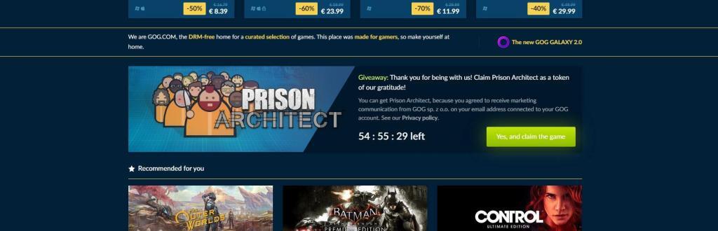 Az ünnepek közeledtével már megszokhattuk, hogy egyre több gyártó próbál a játékosok kedvére tenni. A CD Projekt Red-féle GOG-on is kezdetét vette a karácsonyi leárazás, ami mellé szokás szerint egy ajándék játékot is mellékeltek, ami ezúttal nem más, mint a nagy népszerűségnek örvendő Prison Architect.