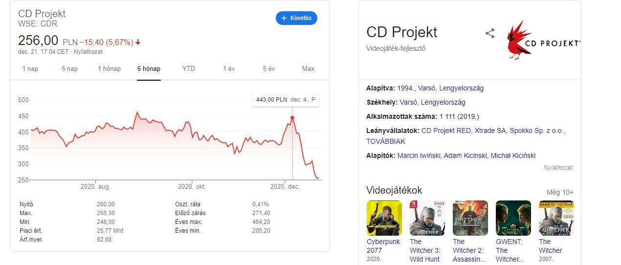 A CD Projekt Red ezúttal nagy fába vágta a fejszéjét. Ez a cég részvényeinek árfolyamában is visszaköszön, aminek a befeketetők már kevésbé tudnak örülni, hiszen folyamatosan esik a lengyel játékfejlesztő cég részvényeinek az értéke.