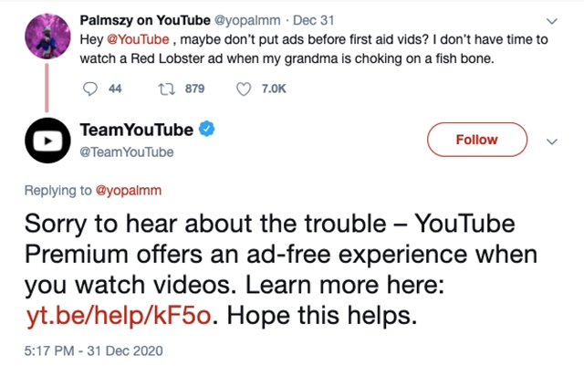 A YouTube Twitter csapata erre hihetetlen módon olyan jellegű válasszal állt elő, hogy akkor legyünk kedvesek megvásárolni a prémiumot és nem lesz reklám.