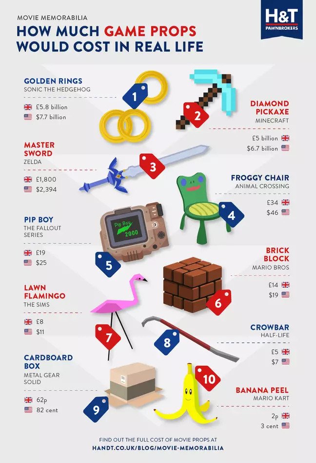Természetesen a tanulmányt készítő csapat nem gyártotta le a való életben a legérdekesebb és legikonikusabb videojáték itemeket, de megkérték az H&T Pawnbrokers értékbecslőit, hogy mérjék fel, mi mennyit érne a valóságban. Az ismert holmikat az alábbi képen látjátok, természetesen angol és amerikai pénznemben. Itt szerepelnek olyan összegek, melyeket átváltani sem érdekes.