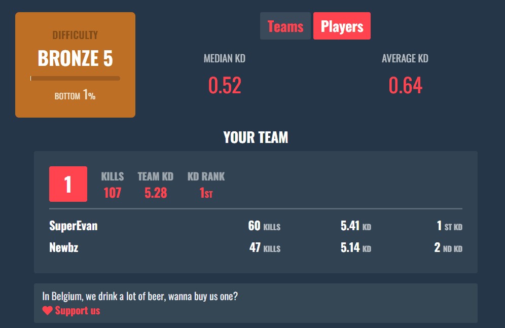 Az elmúlt pár hétben ugyanis elterjedt egy alkalmazás, ami megmutatja, hogy milyen az átlagos K/D arány egy adott meccsben. A közösség szerint a két „rekorder” most Bronze 5 lobby-ba került, ami a lehető legalacsonyabb szintek egyike. Az említett lobby átlagos K/D aránya 0,64 volt, miközben SuperEvan 5,41-es, Newbzz pedig 5,14-es K/D aránnyal bír. Csak 14 másik játékosnak volt magasabb K/D aránya, mindenki másé 1,00 alatt volt.