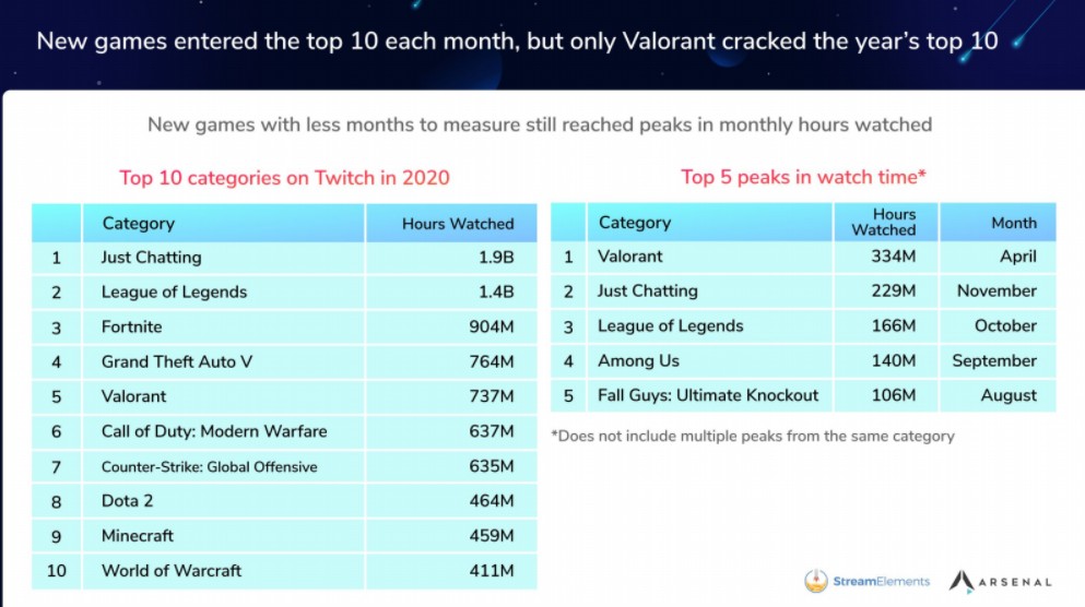 A Twitch különféle játékokkal töltötte fel általában a TOP 10-es nézettségi listákat, ahova csak egyetlen „új” játéknak sikerült bekerülnie, a szerencsés pedig: a VALORANT.