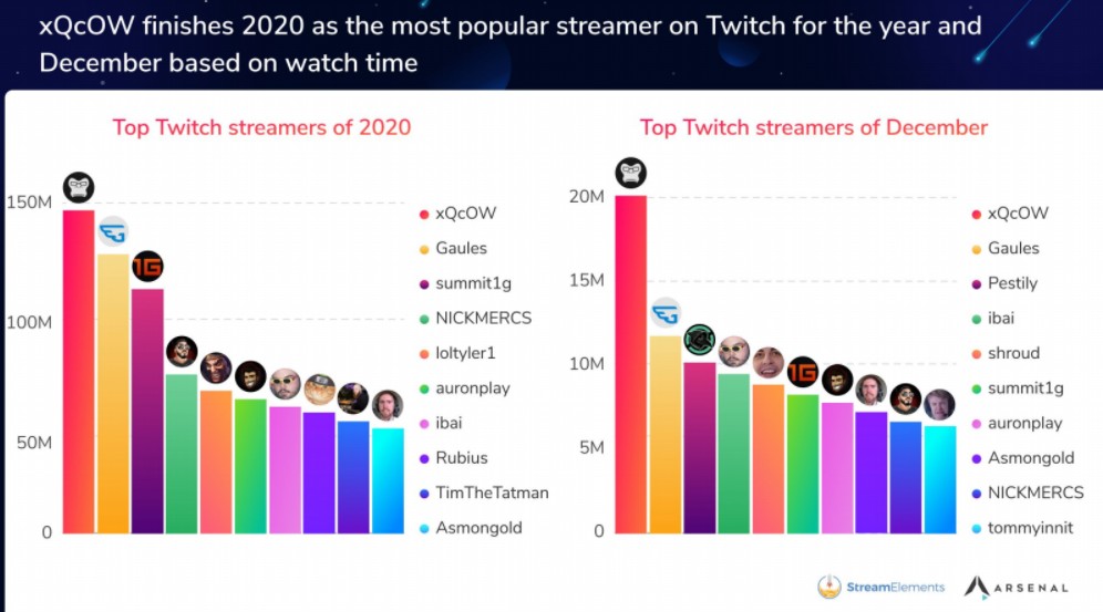 XQc pedig az év utolsó hónapjában visszavette a legnézettebb streamer koronáját, a mintegy 20 millió órányi idővel.