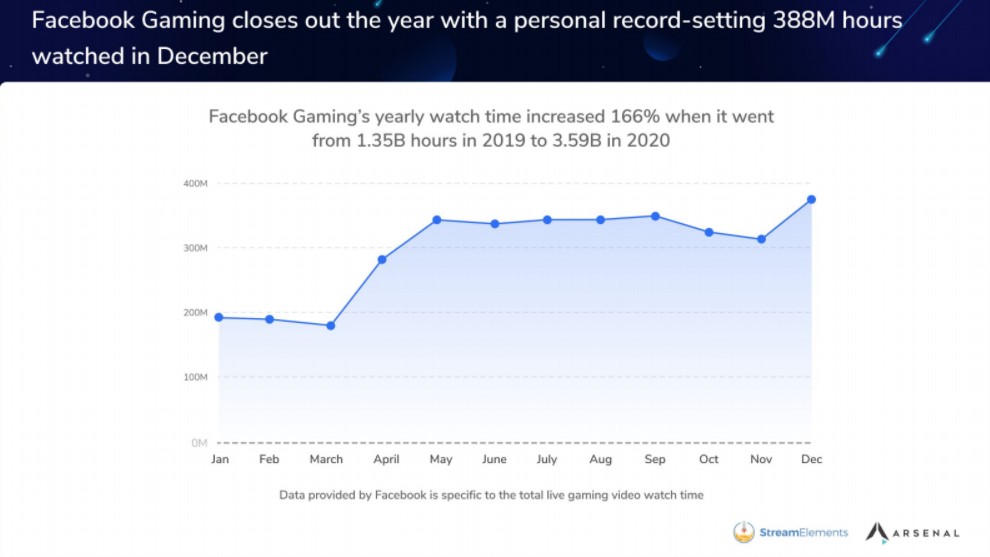 -a StreamElements és az Arsenal.gg weboldalak szerint. A Facebook hasonló növekedést tapasztalt: az elmúlt évben 1,35 milliárd nézett óráról 3,59 milliárdra nőtt.