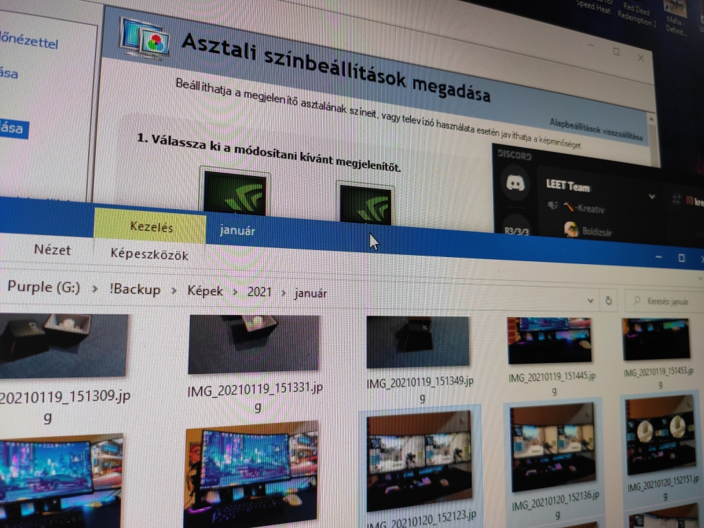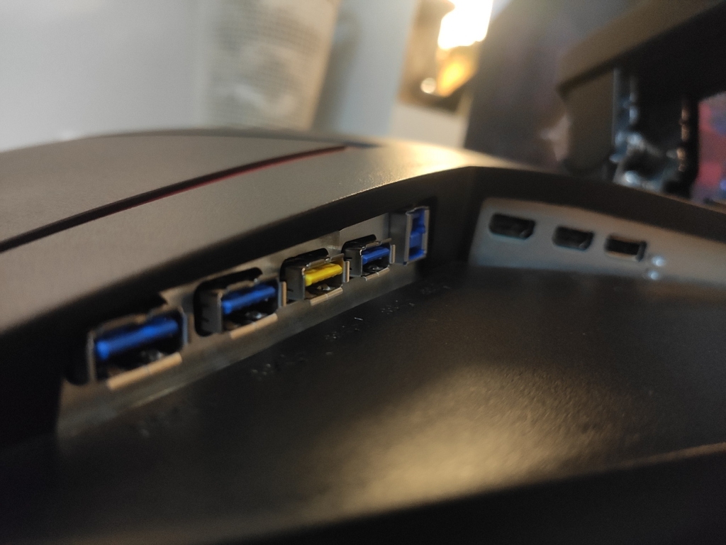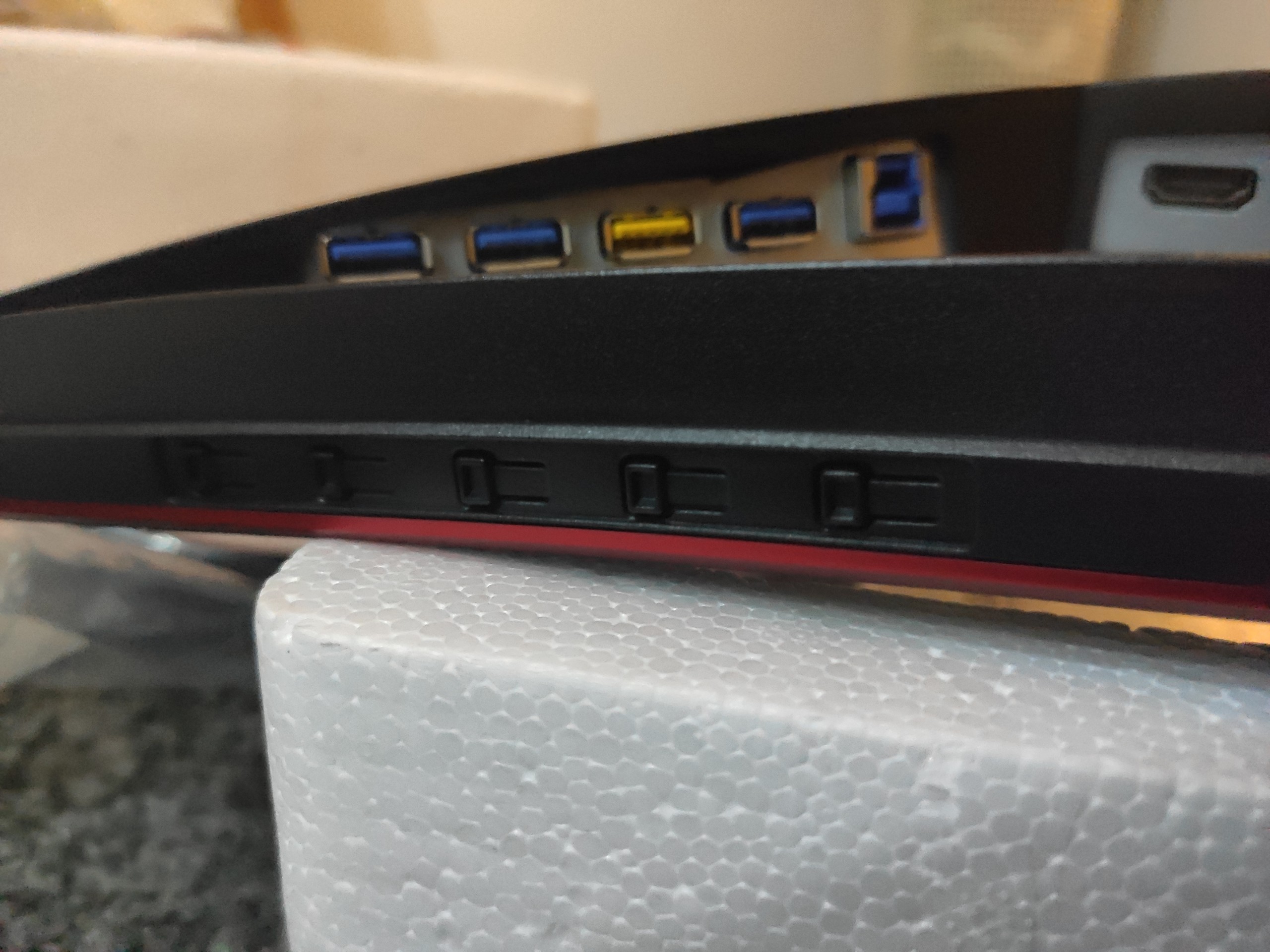 A fenti képen több dolog is megbújik. Egyrészt látható a csatlakozó-Kánaán, ami 4 darab USB 3.2-es portban, egy 3,5 mm-es fejhallgató kimenetben, két HDMI 2.0-ában és egy DispayPort 1.2-ben nyilatkozik meg. A kép közepén pedig a korábbról jól ismert és szívből gyűlölt gombok találhatóak. Ennél rosszabbat keresve se találunk. Teszik a dolgukat egyébként, csak a menü kezelése egy rémálom. Sebaj, a szoftvernek hála ezzel nem igazán kell többé törődnünk.