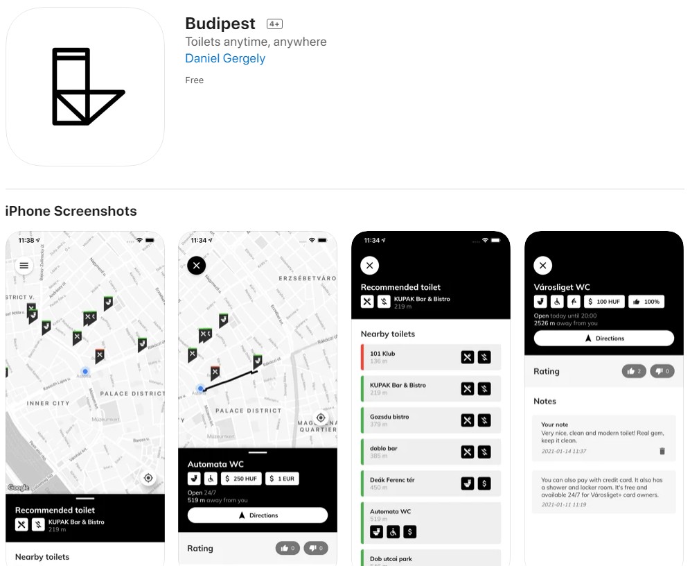 Egészen konkrétan ez egy közvécékereső applikáció, ami azon túl, hogy megmutatja, hol van a legközelebbi nyilvános WC, megjeleníti azokat a helyeket (pl. étterem, bár) is, ahol ingyen használható a mellékhelyiség.