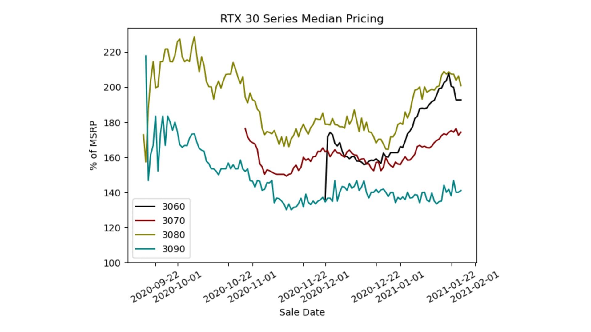 Michael Driscoll elemző nemrég erről készített egy statisztikát az Amazon és egyéb online boltok adatai alapján. Kiderült, hogy a jelenség nem csak a 3000-es széria kártyáit érinti. A korábbi generációk ára is jelentősen megugrott az elmúlt időszakban, akár 100 százalékkal (RTX 20, RTX 16, GTX 1000, and GTX 900 széria).