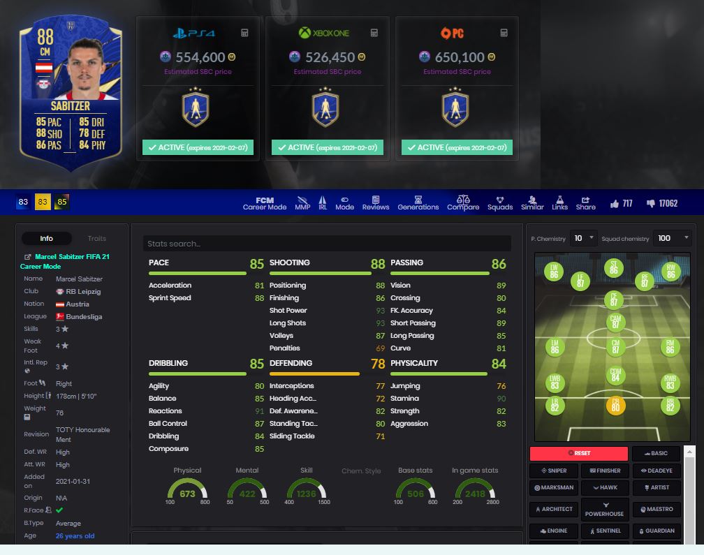Mivel a Bundesligából 4 TOTY játékos is érkezett, így a gondolatmenet jó volt, hogy egy jó SBC-vel mindenki boldog lesz. Sabitzer azért is lehetett volna jó választás, mert jól linkelhető Klostermannal vagy Laimerrel , vagy esetlegesen Alaba is kisegítheti. Hát sajnos ez az SBC eléggé mellé lövés volt. Nagyjából 550 ezer zseton környékén mozog, ami valljuk be, nem olcsó.