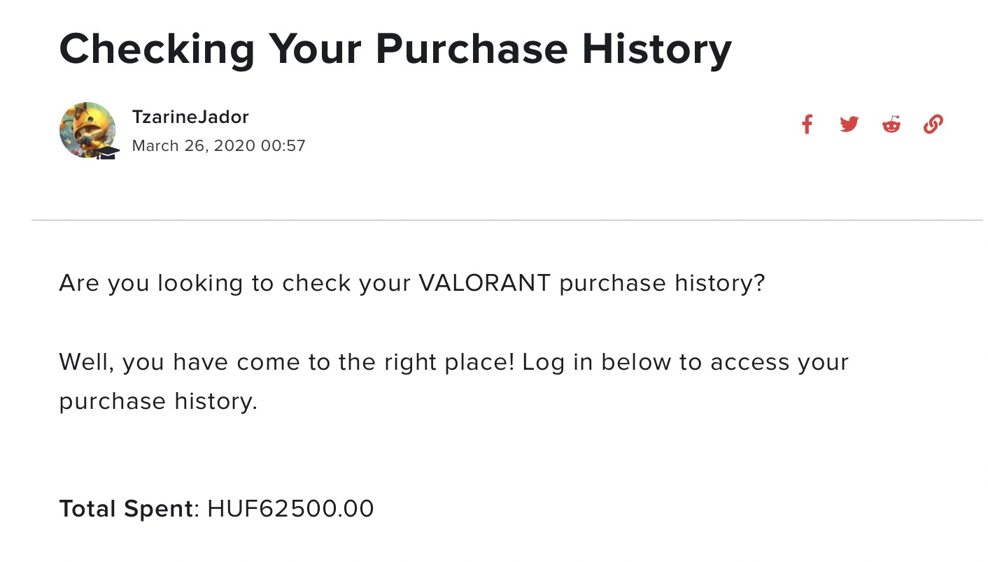 ValorLeaks hívta fel Twitteren a figyelmünket, hogy pár pillanat alatt csekkolhatjuk, hogy mennyit is költöttünk el a Riot Games FPS játékában. Nem kell mást tennünk, mint ellátogatnunk a riot.com/36qL5Iq weboldalára és bejelentkeznünk a Riot azonosítónkkal. Nem kell félni, a Riot Games hivatalos oldalán adjátok meg ezeket!