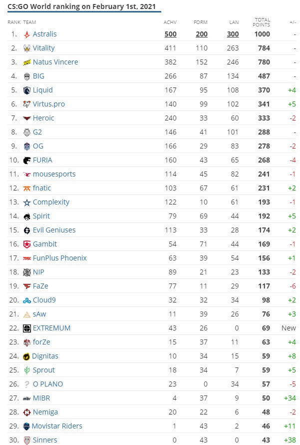 A MIBR és a Sinners valósággal berobbant a listára, előbbi 34, utóbbi 38 pozíciót javított. A brazil szervezet január 15-én jelentette be új felállását és eddig egyszer, a cs_summit 7 során láthattuk őket. Ott 1/3-as mérleggel búcsúztak, de nyertek a FaZe ellen és a Cloud9, illetve a Heroic is megszenvedett ellenük. A világranglistán látott nagy ugrás mégsem ennek, hanem a BOOM korábbi eredményeinek szól, hiszen danoco-n kívül mindenki a hosszú hónapokig veretlen csapatból érkezett.