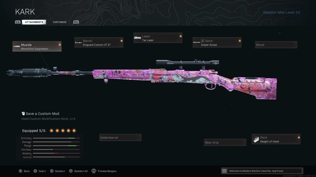 A Monolithic Suppressor és a Singuard Custom 27.6″ együttesen hozzásegítenek a megfelelő sebzéshez egy elég nagy hatótávolságon belül – így például nem tűnsz fel a mini mapokon -, továbbá növelik a golyó sebességét is, így nem lesz probléma, hogy messzebb helyezkedsz el. Ezzel egyidejűleg a Tac Laser fantasztikus az ADS sebességéhez és a Sniper Scope pedig minőségi zoomot biztosít anélkül, hogy túl nagy ADS-terhet jelentene.