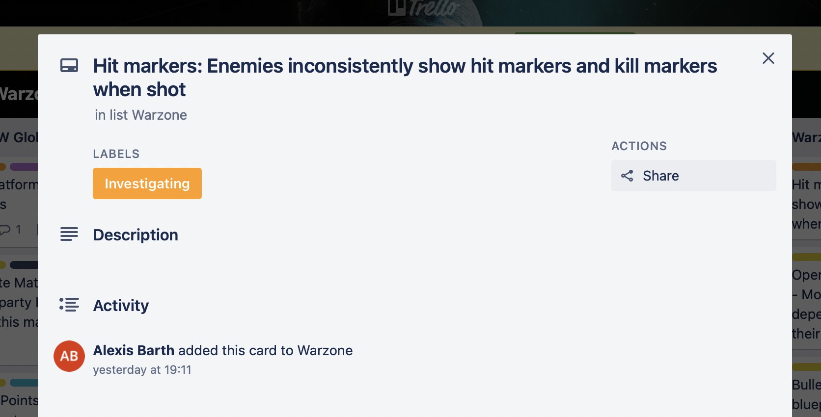 Az update után a játékosok észrevették, hogy a hit- és killmarkerek meglehetősen inkonzisztensen működnek. Sajnos nem is kellett sokat várnunk a megerősítésre, a Warzone Trello oldalán a fejlesztők elismerték a bug létezését. Jelenleg az Investigating taggel illetik, azaz még erősen vizsgálják milyen probléma is állhat a jelenség mögött. Reméljük hamarosan javítják!