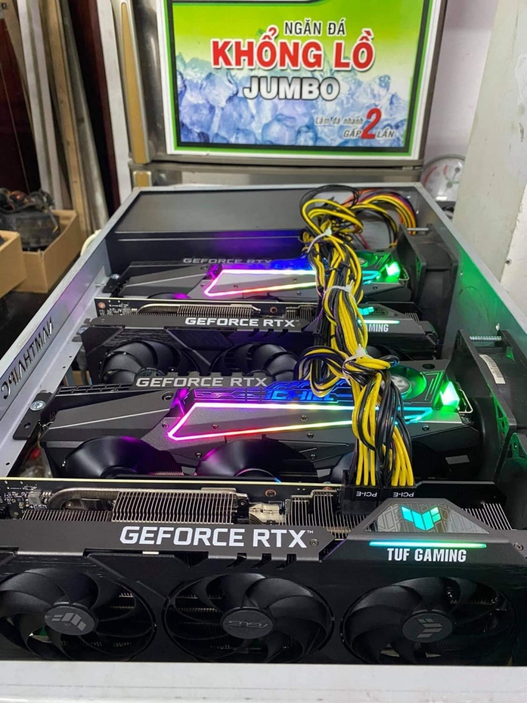 A Videocardz portál például olvasóiktól kaptak olyan képeket, melyeken RTX 30-as kártyák tucatjait láthatjuk Bitcoin bányászat közben: