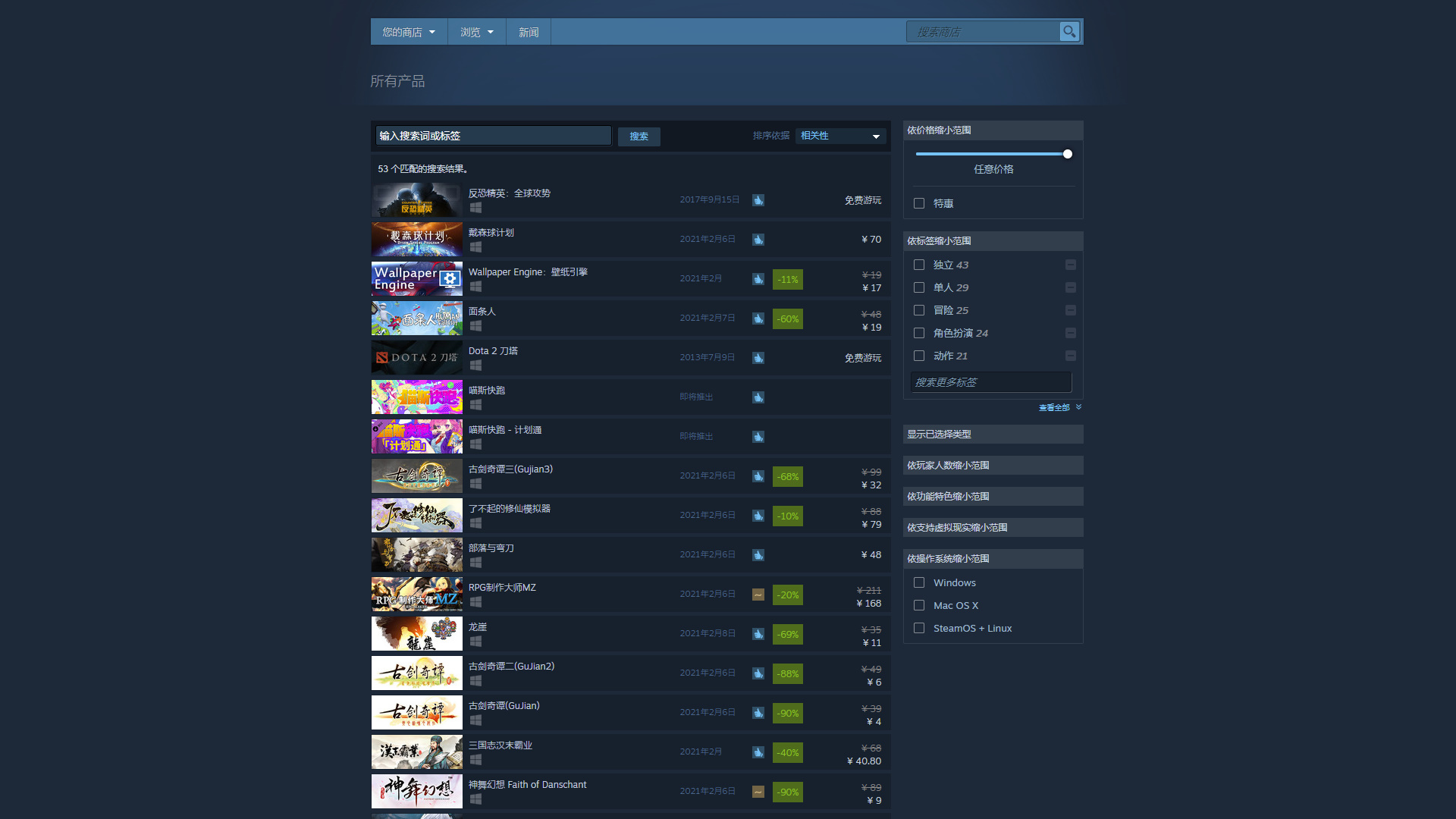 A Steam csak olyan játékokat árul az új áruházban, melyek természetesen kormányzati engedélyt kaptak. A nemzetközi 21.131 játék közül ezt 53 kapta meg. Kicsit úgy néz ki az áruház, ahogy mondjuk 2010-ben kinézett. Nehéz elképzelni, hogy ilyen felhozatallal miért akarna bárki Kínában erre a verzióra váltani, a nemzetközi, bár illegálisan elért verzió helyett.