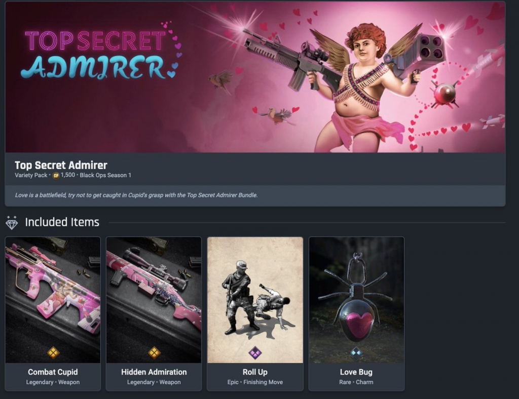 Érkezik továbbá a Valentin-nap megünneplésére az új Top Secret Admirer bundle, amely magában foglal egy Combat Cupid blueprintes pink tactical riflet valamint a Hidden Admiration snipert is.