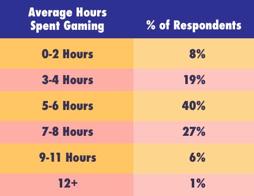 A kutatásban résztvevő gamerek 40 százaléka átlagosan 5-6 órát tölt a játék előtt egy nap, ami évente nagyjából 1825-2190 órát jelent. Egy évben 8760 óra van, így a több mint 2 ezer óra igen nagy szám. Ne feledjük, hogy az alvás, az evés, a munka, az iskola, a szociális élet ebbe még mind bele kell férjen. A válaszadók 27 százaléka 7-8 órát játszik egy nap, ami gyakorlatilag egy teljes munkaidő.