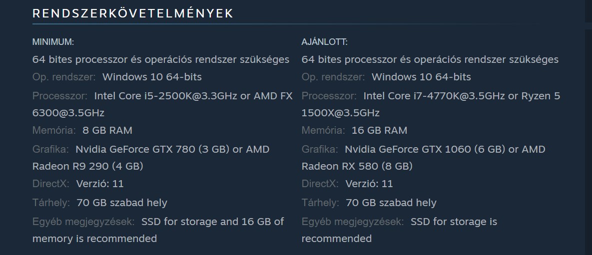 A sok-sok zombi ellenére azonban úgy tűnik, hogy nem kell különösebben aggódni a specifikáció miatt. Az ajánlott processzor az Intel Core i7-4770K vagy a Ryzen 5 1500, GeForce GTX 1060 vagy AMD Radeon RX 580 párosításával.