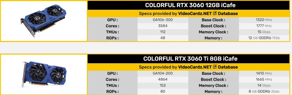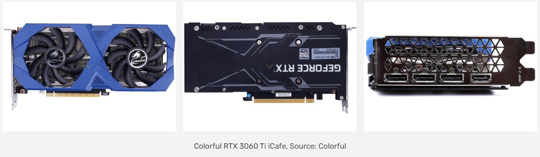 A Colorful a legnagyobb GeForce partner Kínában, ám talán még így is kevesen számítottak rá, hogy megjelenik a Colorful iCafe – írja a Videocardz. Egészen pontosan a GeForce RTX 3060 Ti 8GB iCafe és az RTX 3060 12GB iCafe modelleket jelentették be, melyek egyedi kétventilátoros hűtőt kaptak. Mindkét kártya nagyjából egyformának látszik, de a GPU különbözik (GA104 és GA106).