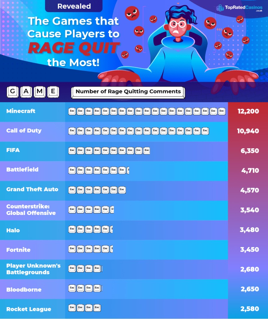 A TopRatedCasinos.co.uk vezetésével egy olyan felmérés készült, melynek során több kutatás eredményét és több ezer Reddit kommentet elemeztek, kifejezetten a rage quit jelenségre összpontosítva. Ez alapján kiderült, hogy a gamerek mely játékok miatt lesznek leginkább dühösek és lépnek ki belőlük emiatt.