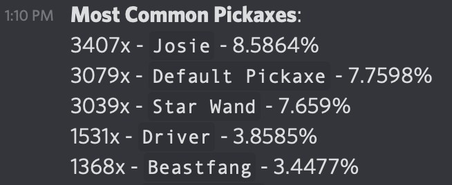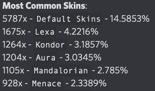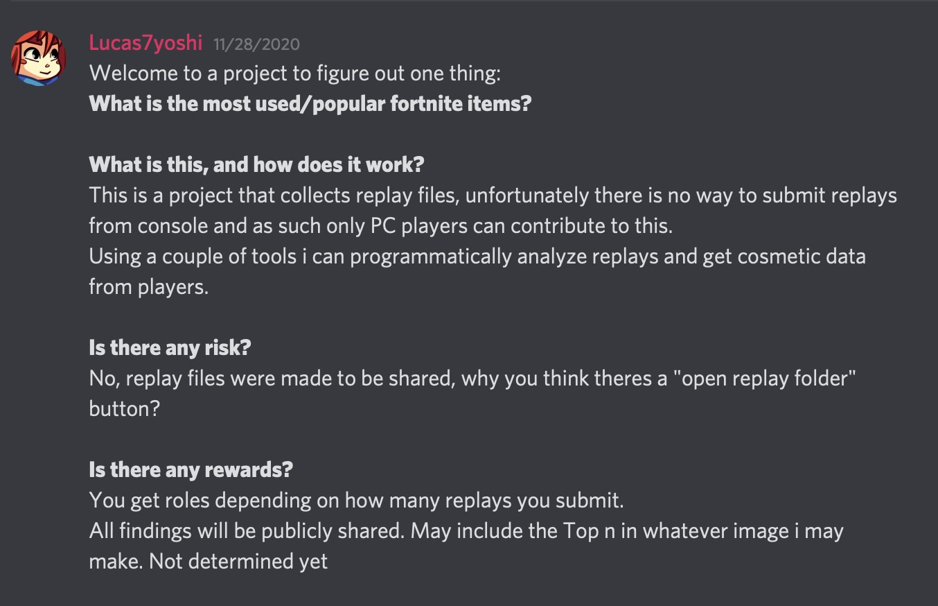 Lucas7Yoshi beüzemelt egy Discord szervert, ahová a felhasználók feltölthették a replay fájljaikat, majd ezeket egy automatizált bot kielemezte. Az adatbányász arra volt kíváncsi, hogy mely skineket, és egyéb kozmetikai tárgyakat használták a legtöbbet a játékosok.