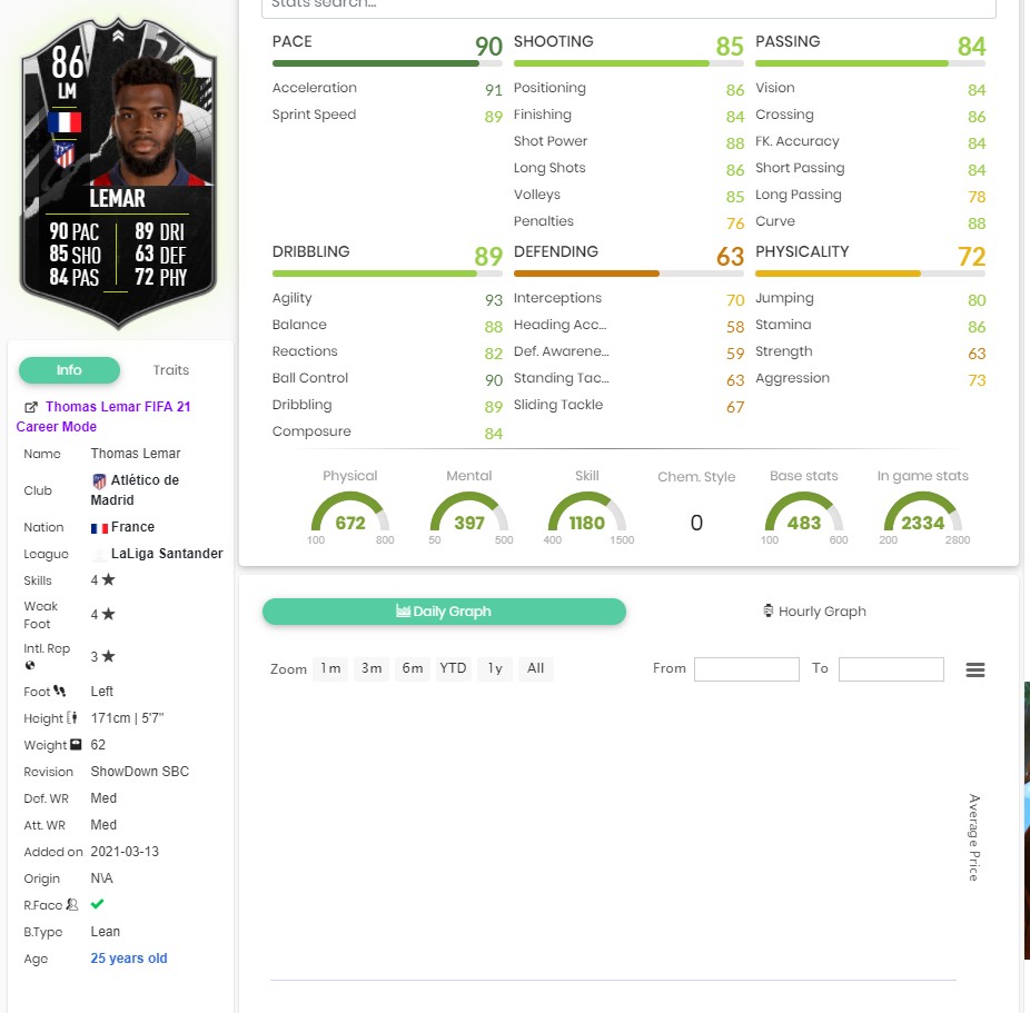 A másik játékos Lemar. Én a tavalyi FUT birthday lapját nagyon szerettem, de annak 5 csillagos gyengébbik lába volt. Inkább egy átlagos játékosnak mondanám, sajnos semmilyen extrát nem nyújt jelenlegi állapotában.Fejlesztésekkel se lesz hosszútávon igazán életképes a lap, és szerintem max egy hétig bírja majd a legtöbb klubban. Ráadásul 1:0 a két csapat közötti párharc, szóval mind a két oldal nyerhet.