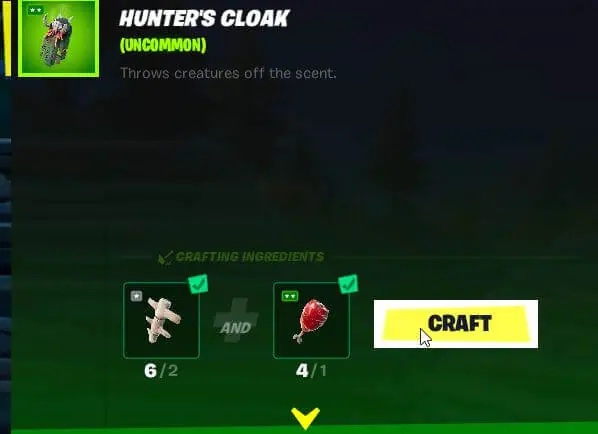 Ez okozhatná talán a legnagyobb fejtörést, hiszen az Epic Games semmi segítséget nem adott a dologhoz. Szerencsére a játékosok hamar rájöttek, hogy tudják létrehozni a Hunter’s Cloak tárgyat. Húsra és csontra van szükségünk, melyekhez már mindenképp szükségünk lesz néhány állat levadászásához. A húst, mint tárgyat kell felfejlesztenünk.