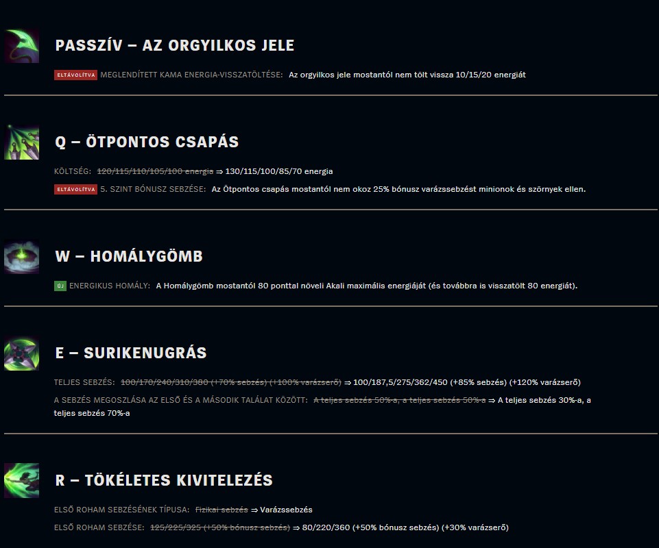 A „normál” játékmódban Akali ezeket a változásokat kapja: