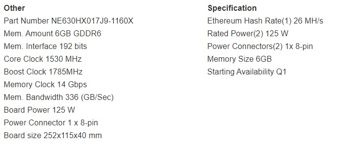 A kiskereskedő megerősíti, hogy a bányakártya 6 GB-os GDDR6 memóriával rendelkezik. Az 1530 MHz-es és 1785 MHz-es alap és boost órajel megfelel a GeForce GTX 1660 SUPER teljesítményének. Ami a legfontosabb, hogy a kártyának nincsenek kijelző csatlakozói, tehát nem használható játékra.